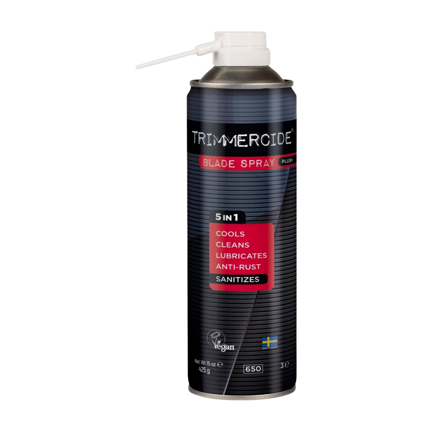 Trimmercide Blade spray+ contains 5 functions in one (425 g). It cools, cleans, lubricates, prevents rust and disinfects blades.