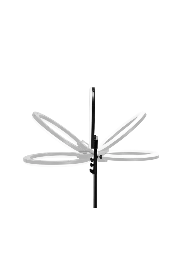 Pakkaus sisältää: rengasvalon, virtajohdon, jalustan, puhelintelineet ja kaukosäätimen.