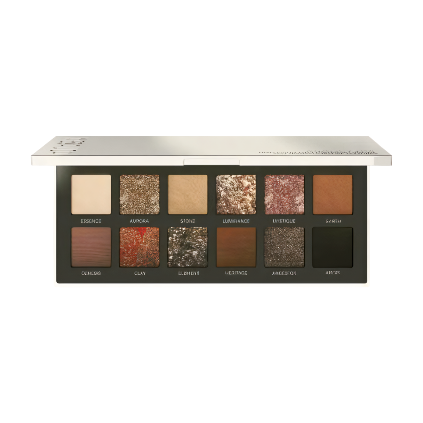 INCI: ESSENCE (1): MICA, CI 77891/TITANIUM DIOXIDE, ZEA MAYS STARCH/ZEA MAYS (CORN) STARCH, SILICA, MAGNESIUM MYRISTATE, DIMETHICONE, PENTAERYTHRITYL TETRAISOSTEARATE, OCTYLDODECANOL, CI 77492/ IRON OXIDES, C10-18 TRIGLYCERIDES, DECYLENE GLYCOL, SYNTHETIC BEESWAX, CI 77491/IRON OXIDES, LAUROYL LYSINE. AURORA (2): CALCIUM ALUMINUM BOROSILICATE, MICA, CALCIUM SODIUM BOROSILICATE, HYDROGENATED ETHYLHEXYL OLIVATE, DIMETHICONE, C10-18 TRIGLYCERIDES, OCTYLDODECANOL, CI 77891/TITANIUM DIOXIDE, CI 77000/ALUMINUM POWDER, CI 77491/IRON OXIDES, HYDROGENATED VEGETABLE OIL, SYNTHETIC FLUORPHLOGOPITE, POLYHYDROXYSTEARIC ACID, DODECANE, COCONUT ALKANES, DISTEARDIMONIUM HECTORITE, CI 77499/IRON OXIDES, OCTYLDODECYL STEAROYL STEARATE, ETHYLHEXYL POLYHYDROXYSTEARATE, HYDROGENATED OLIVE OIL UNSAPONIFIABLES, PROPYLENE CARBONATE, SILICA, TIN OXIDE, PROPANEDIOL, DECYLENE GLYCOL, NEOPENTYL GLYCOL DIETHYLHEXANOATE, 1,2-HEXANEDIOL, DIMETHICONE/VINYL DIMETHICONE CROSSPOLYMER, COCO CAPRYLATE/CAPRATE, SIMMONDSIA CHINENSIS SEED OIL/ SIMMONDSIA CHINENSIS (JOJOBA) SEED OIL, CAPRYLHYDROXAMIC ACID. STONE (3): MICA, CI 77891/TITANIUM DIOXIDE, ZEA MAYS STARCH/ ZEA MAYS (CORN) STARCH, CI 77491/IRON OXIDES, CI 77492/IRON OXIDES, SILICA, MAGNESIUM MYRISTATE, CI 77499/IRON OXIDES, DIMETHICONE, PENTAERYTHRITYL TETRAISOSTEARATE, OCTYLDODECANOL, C10-18 TRIGLYCERIDES, DECYLENE GLYCOL, SYNTHETIC BEESWAX, LAUROYL LYSINE. LUMINANCE (4): SYNTHETIC FLUORPHLOGOPITE, CI 77000/ALUMINUM POWDER, CALCIUM ALUMINUM BOROSILICATE, MICA, HYDROGENATED POLYISOBUTENE, CALCIUM SODIUM BOROSILICATE, DIMETHICONE, CI 77491/IRON OXIDES, CI 77891/TITANIUM DIOXIDE, DIISOSTEARYL MALATE, ZINC STEARATE, SILICA, TRIMETHYLSILOXYSILICATE, ETHYLENE/PROPYLENE/STYRENE COPOLYMER, PROPANEDIOL, DECYLENE GLYCOL, TIN OXIDE, ETHYLHEXYLGLYCERIN, 1,2-HEXANEDIOL, BUTYLENE/ETHYLENE/STYRENE COPOLYMER, CAPRYLHYDROXAMIC ACID, PENTAERYTHRITYL TETRA-DI-T-BUTYL HYDROXYHYDROCINNAMATE. MYSTIQUE (5): MICA, CI 77891/TITANIUM DIOXIDE, CI 77000/ALUMINUM POWDER, DIMETHICONE, CI 77491/IRON OXIDES, SYNTHETIC FLUORPHLOGOPITE, ZINC STEARATE, DIISOSTEARYL MALATE, STEARYL DIMETHICONE, OCTYLDODECYL STEAROYL STEARATE, SILICA, TRIMETHYLSILOXYSILICATE, ETHYLHEXYLGLYCERIN, PROPANEDIOL, DECYLENE GLYCOL, 1,2-HEXANEDIOL, TIN OXIDE, CAPRYLHYDROXAMIC ACID. EARTH (6): MICA, CI 77891/TITANIUM DIOXIDE, CI 77491/IRON OXIDES, CI 77499/IRON OXIDES, CI 77492/IRON OXIDES, ZEA MAYS STARCH/ ZEA MAYS (CORN) STARCH, SILICA, MAGNESIUM MYRISTATE, DIMETHICONE, PENTAERYTHRITYL TETRAISOSTEARATE, OCTYLDODECANOL, C10-18 TRIGLYCERIDES, DECYLENE GLYCOL, SYNTHETIC BEESWAX, LAUROYL LYSINE. GENESIS (7): MICA, CI 77491/IRON OXIDES, CI 77499/IRON OXIDES, CI 77492/IRON OXIDES, ZEA MAYS STARCH/ZEA MAYS (CORN) STARCH, SILICA, MAGNESIUM MYRISTATE, DIMETHICONE, PENTAERYTHRITYL TETRAISOSTEARATE, OCTYLDODECANOL, CI 42090/BLUE 1 LAKE, C10-18 TRIGLYCERIDES, DECYLENE GLYCOL, SYNTHETIC BEESWAX, LAUROYL LYSINE. CLAY (8): MICA, CI 77491/IRON OXIDES, ETHYLHEXYL PALMITATE, CAPRYLIC/ CAPRIC TRIGLYCERIDE, DIMETHICONE, ZINC STEARATE, CI 77499/IRON OXIDES, SYNTHETIC FLUORPHLOGOPITE, SILICA, C30-45 ALKYL DIMETHICONE, CI 77891/TITANIUM DIOXIDE, DIMETHICONOL, DECYLENE GLYCOL, TIN OXIDE. ELEMENT (9): CI 77891/TITANIUM DIOXIDE, CI 77499/IRON OXIDES, MICA, SYNTHETIC FLUORPHLOGOPITE, ETHYLHEXYL PALMITATE, CAPRYLIC/CAPRIC TRIGLYCERIDE, DIMETHICONE, ZINC STEARATE, SILICA, C30-45 ALKYL DIMETHICONE, TIN OXIDE, DIMETHICONOL, DECYLENE GLYCOL. HERITAGE (10): MICA, CI 77491/IRON OXIDES, CI 77499/IRON OXIDES, ZEA MAYS STARCH/ZEA MAYS (CORN) STARCH, CI 77492/ IRON OXIDES, SILICA, MAGNESIUM MYRISTATE, CI 16035/RED 40 LAKE, DIMETHICONE, PENTAERYTHRITYL TETRAISOSTEARATE, OCTYLDODECANOL, C10-18 TRIGLYCERIDES, DECYLENE GLYCOL, SYNTHETIC BEESWAX, LAUROYL LYSINE. ANCESTOR (11): MICA, CI 77400/COPPER POWDER, CALCIUM ALUMINUM BOROSILICATE, CI 77499/IRON OXIDES, HYDROGENATED POLYISOBUTENE, DIMETHICONE, CALCIUM SODIUM BOROSILICATE, ZINC STEARATE, CI 77891/TITANIUM DIOXIDE, CI 77491/IRON OXIDES, TRIMETHYLSILOXYSILICATE, ETHYLENE/PROPYLENE/STYRENE COPOLYMER, SILICA, PROPANEDIOL, DECYLENE GLYCOL, TIN OXIDE, 1,2-HEXANEDIOL, BUTYLENE/ETHYLENE/STYRENE COPOLYMER, CAPRYLHYDROXAMIC ACID, PENTAERYTHRITYL TETRA-DI-T-BUTYL HYDROXYHYDROCINNAMATE. ABYSS (12): CI 77499/ IRON OXIDES, MICA, SILICA, CI 77266 (nano)/BLACK 2, OCTYLDODECYL STEAROYL STEARATE, PENTAERYTHRITYL TETRAISOSTEARATE, POLYGLYCERYL-3 DIISOSTEARATE, DIMETHICONE, PHENYL TRIMETHICONE, PROPANEDIOL, DECYLENE GLYCOL, POLYHYDROXYSTEARIC ACID, 1,2-HEXANEDIOL, CAPRYLHYDROXAMIC ACID.