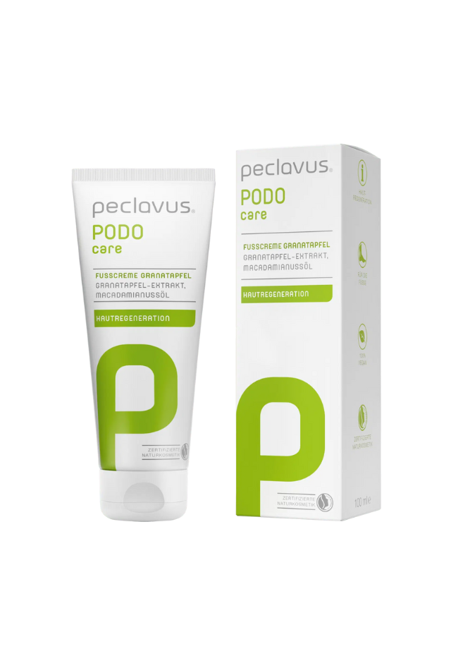 Peclavus® PODOcare Granaattiomena-jalkavoide uudistaa ihoa ja jättää jalat hedelmäisen raikkaiksi. Luonnolliset antioksidantit soluja uudistavasta luomugranaattiomenauutteesta ja arvokkaasta luomuvilliruusuöljystä varmistavat tämän. Rikas macadamiapähkinäöljy suojaa myös ihon suojakerrosta. Optimaalinen hoito stressaantuneille jaloille. Sopii kaikille ihotyypeille, sekä päivittäiseen käyttöön.